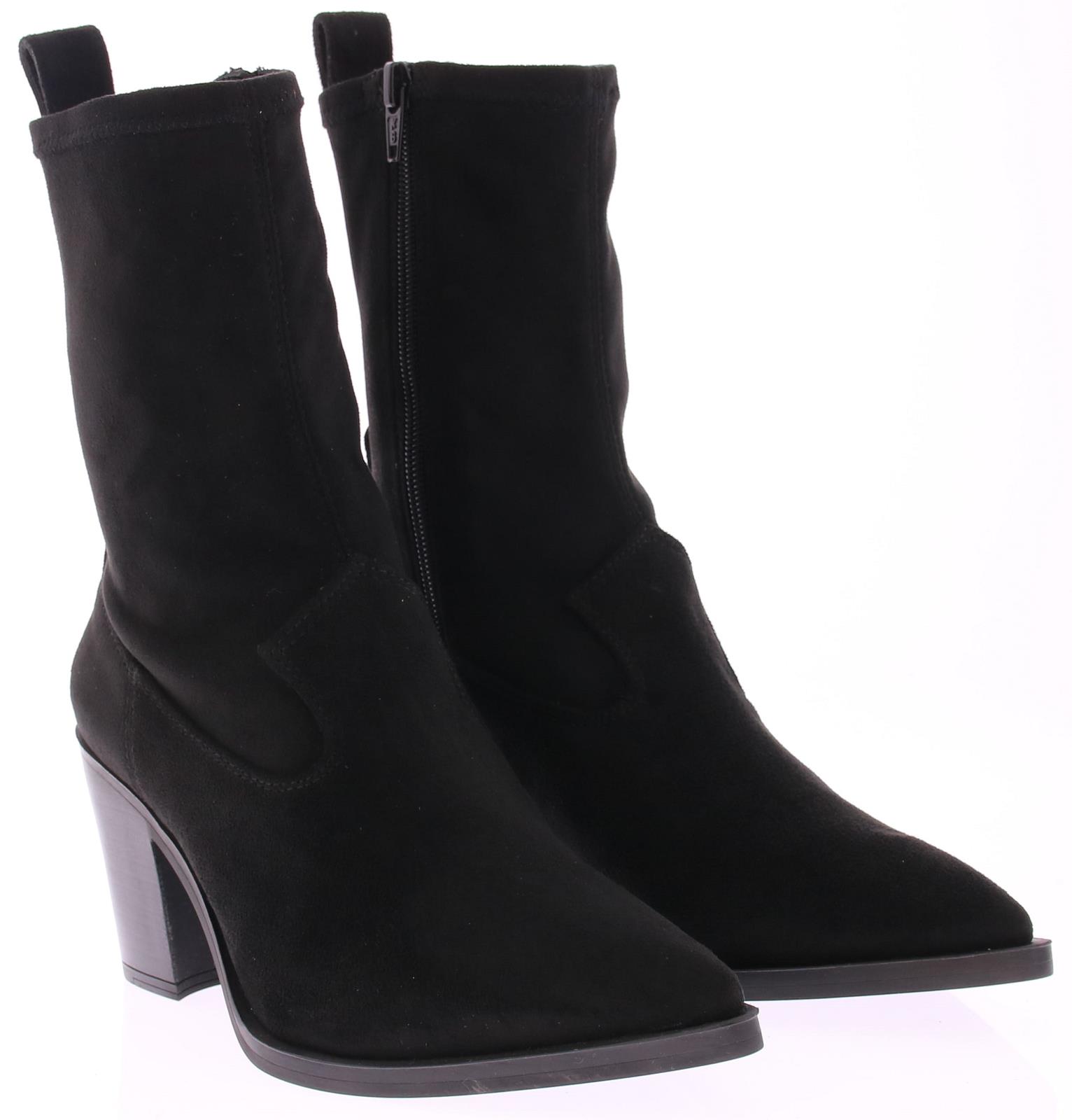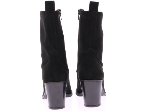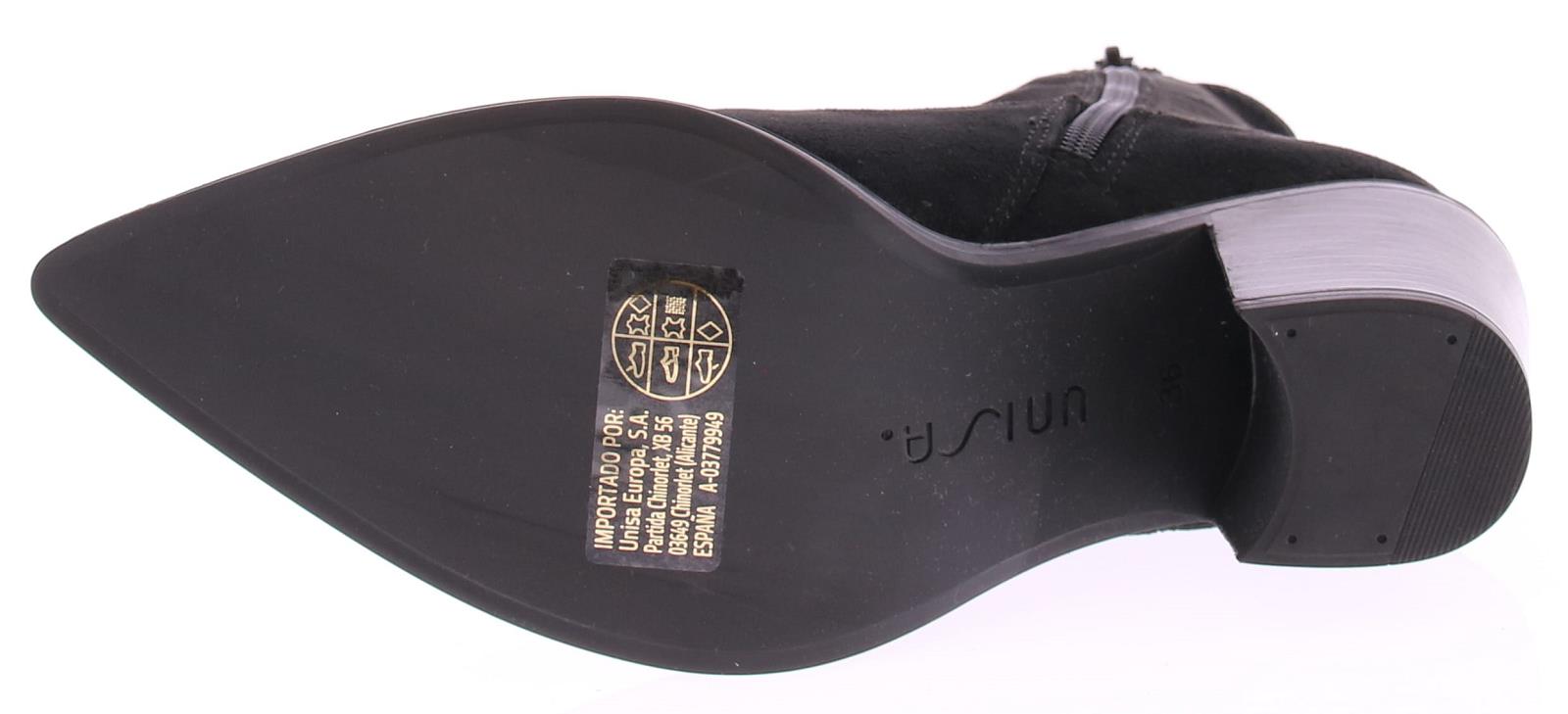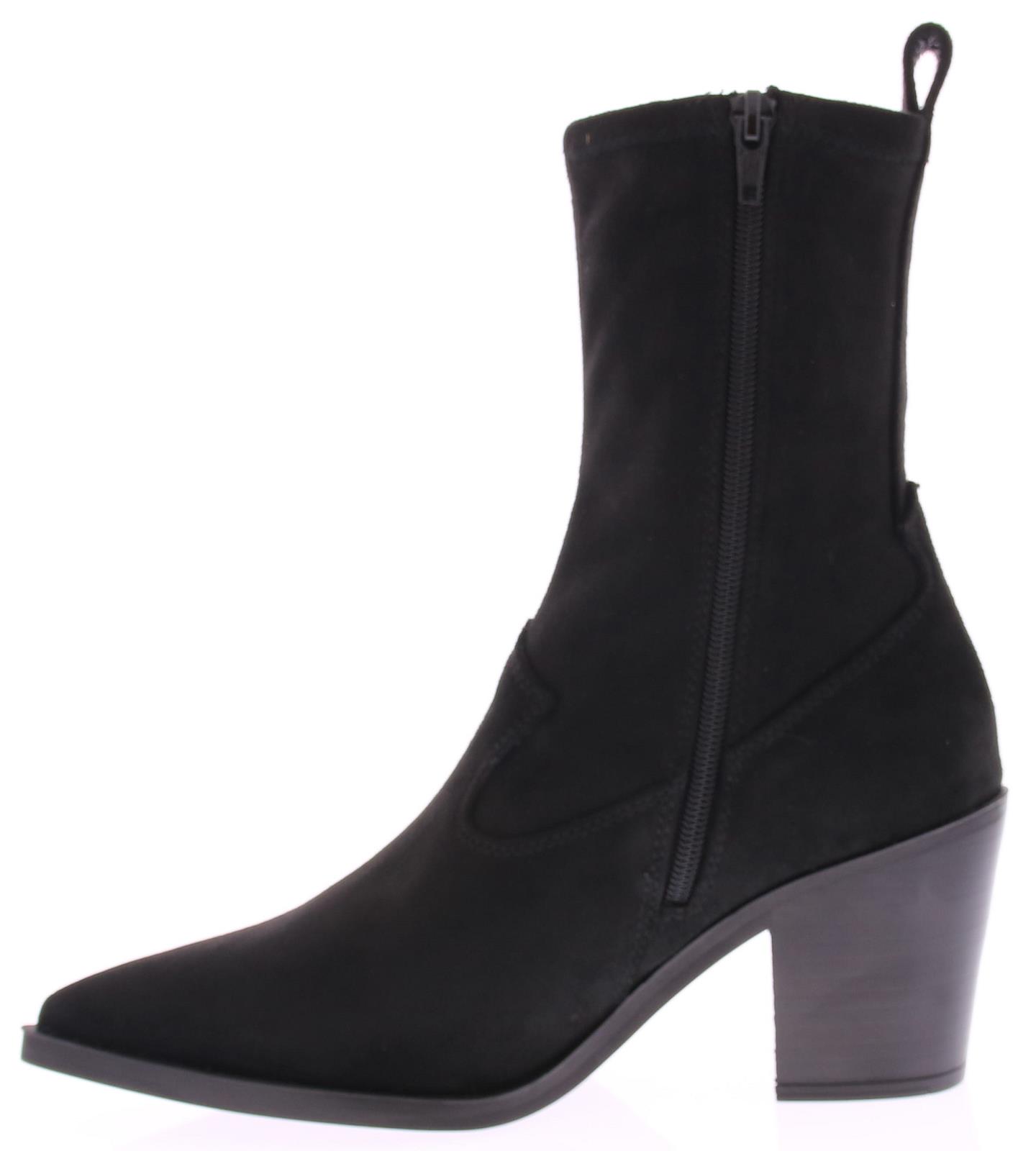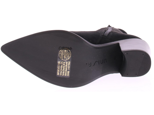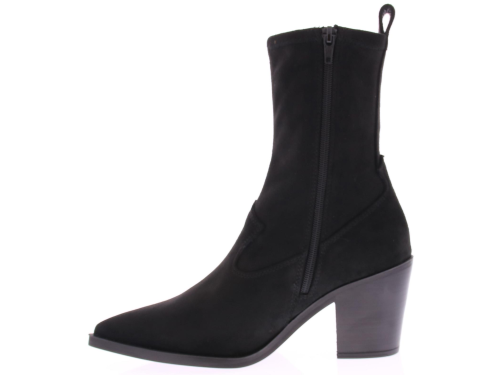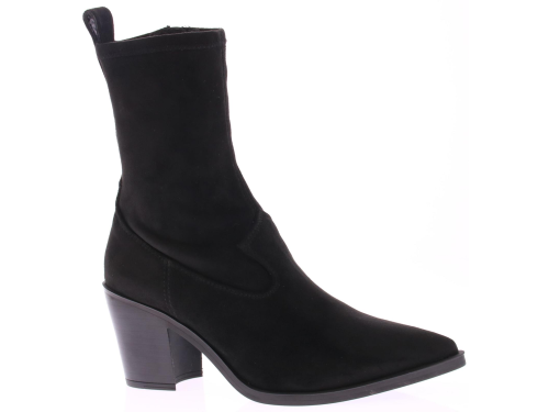 Zwarte suede dames enkellaars van Unisa. Dit city western model heeft een elastische schacht en een 6 cm stoere maar vrouwelijk hak. De leest is spits met een wat ruimere zoolrand er om heen.