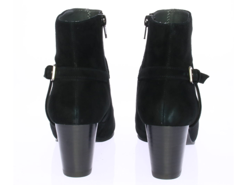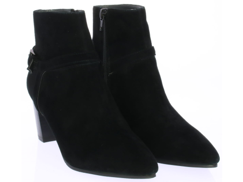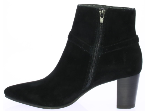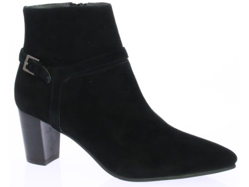 Zwart suede dames enkellaars van Vivian Ray met rond de enkel een sier bandje met een gespje aan de buitenkant. De hak is 6 cm.