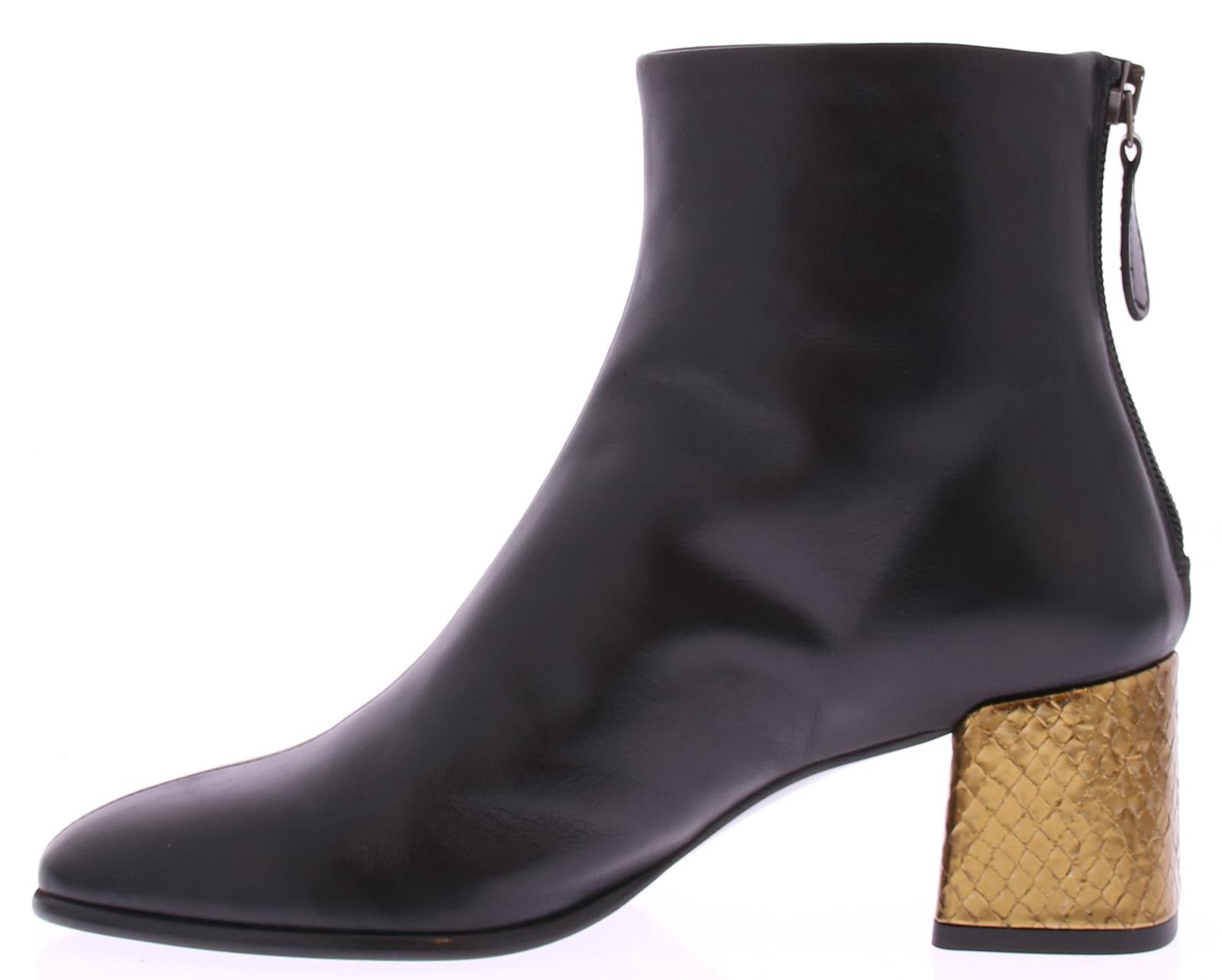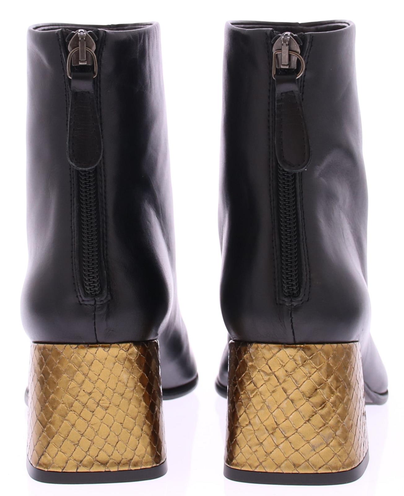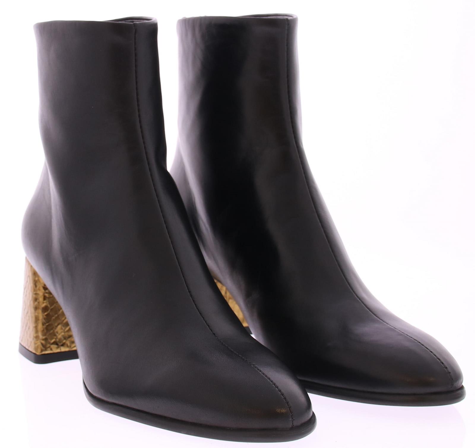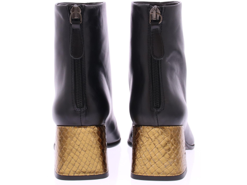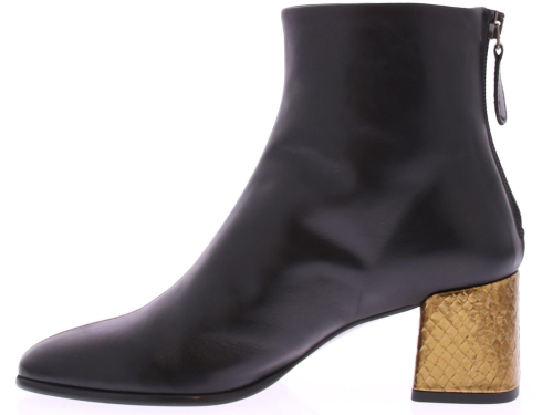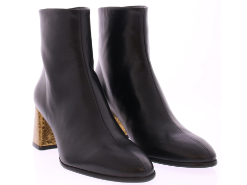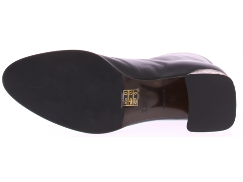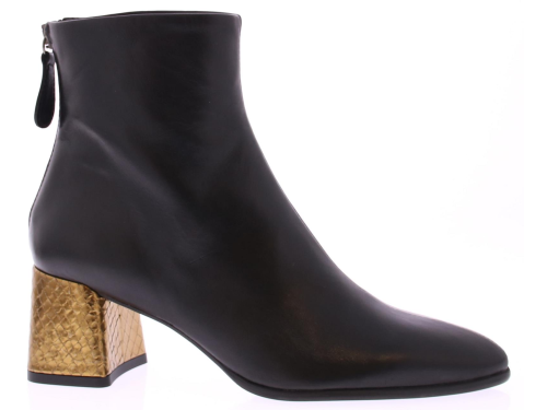 Zwarte leren dames enkellaars van Zinda. Op een afgeronde leest met rits aan de achterkant. Het comfortabele blokhakje van 5 cm is bekleed met goud leer met een schubbenprintje. De voering is van leer en de zool van dun rubber.