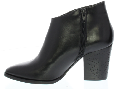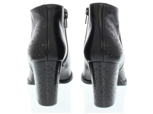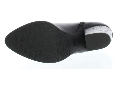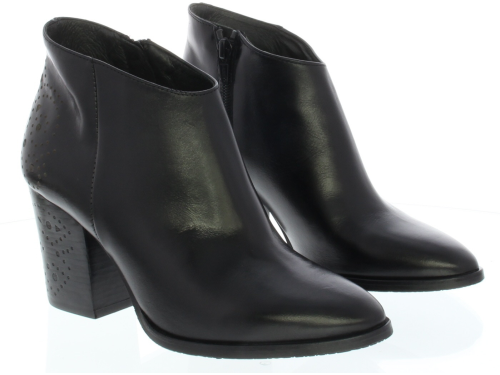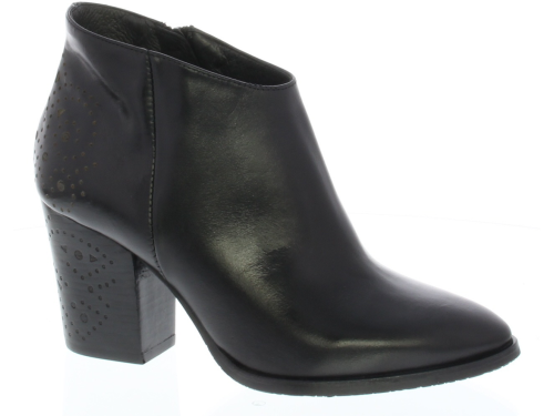 Dames enkellaarsje van Zinda. Uitgevoerd in het glad leer met een perforatiepatroon op de hiel en op de hak. De leest is wat spitser op een stoere hak. Door de schuin aflopende korte schacht is hij ook in heel leuk met een jurkje of rokje.