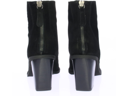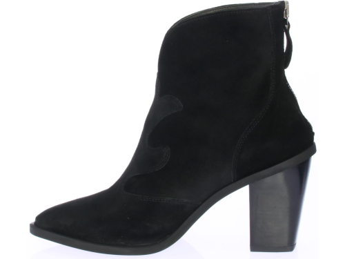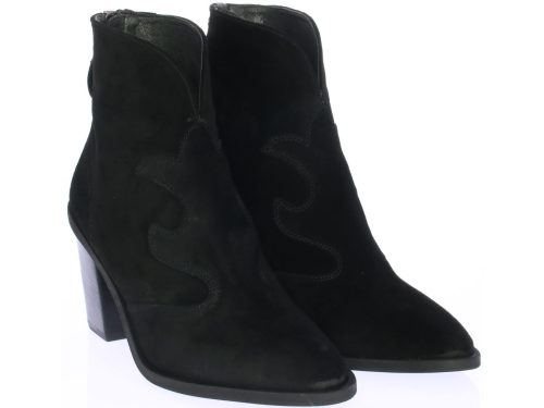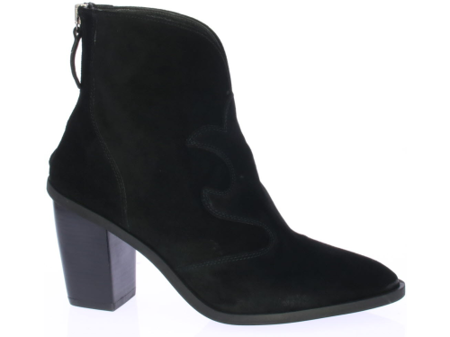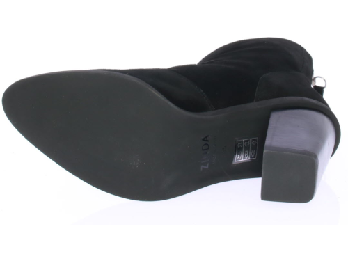 Zwart suede kort dames laars van Zinda. De laars heeft een rits op de hiel en een inkeping aan de voorkant van de schacht. Op de voorvoet zit een subtiel patroon van stiksels.