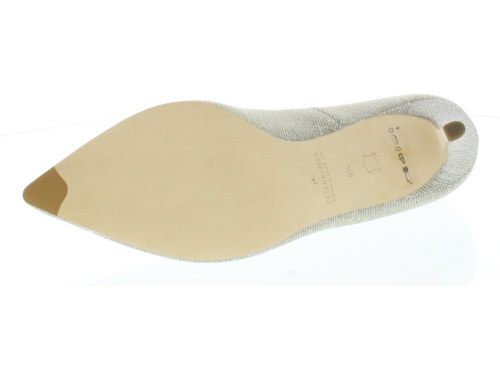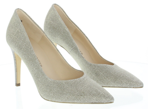 Platinakleurige stoffen dames pump van Peter Kaiser. Deze pump is uitgevoerd in een aantrekkelijke glitterstof met een spitse neus voor de feestelijke gelegenheden. De pump heeft een 9 cm hoge beklede hak en is volledig leer gevoerd. De pump heeft een leren zool. Bij de pump is een bijpassende clutch verkrijgbaar.